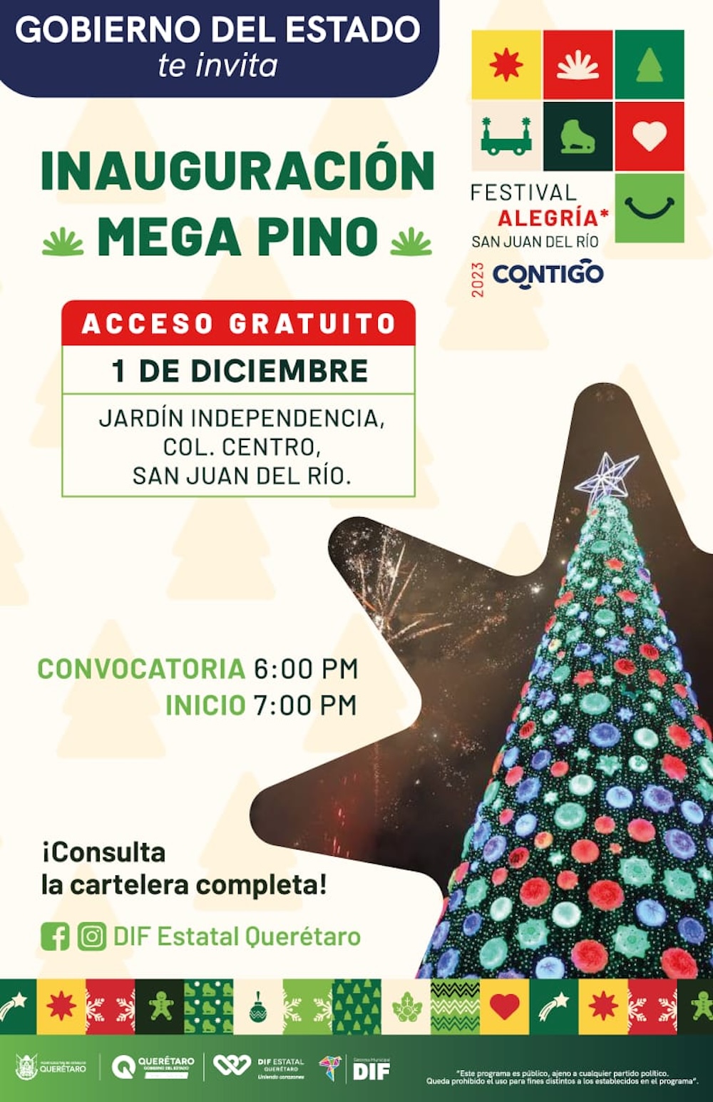 Este viernes primero de diciembre dará inicio el Festival Alegría 2023, el cual arrancará con el encendido del Mega Pino Navideño, alrededor de las 19:00 horas en la Plaza Independencia. El festival –cuyo objetivo es fortalecer los valores, estrechar lazos familiares y compartir un ambiente de sano esparcimiento– forma parte del trabajo en equipo entre los Sistemas Estatal y Municipal para el Desarrollo Integral de la Familia, y el gobierno municipal de San Juan del Río.