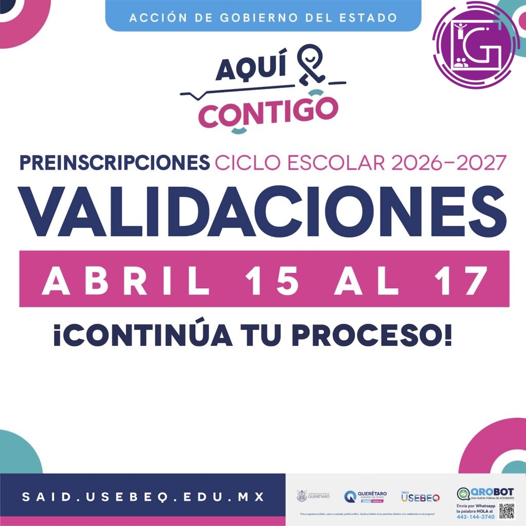 La Unidad de Servicios para la Educación Básica en el Estado de Querétaro (USEBEQ), recuerda que del 15 al 17 de abril las madres, padres de familia o tutores pueden validar y aceptar en la página said.usebeq.edu.mx los resultados que corresponden a la distribución de los espacios para los estudiantes de nuevo ingreso a 2º y 3º de preescolar, así como los aspirantes a 1º de primaria y secundaria que optaron por participar en una segunda asignación al rechazar su preasignación durante el proceso de preinscripciones para el ciclo escolar 2026-2027.