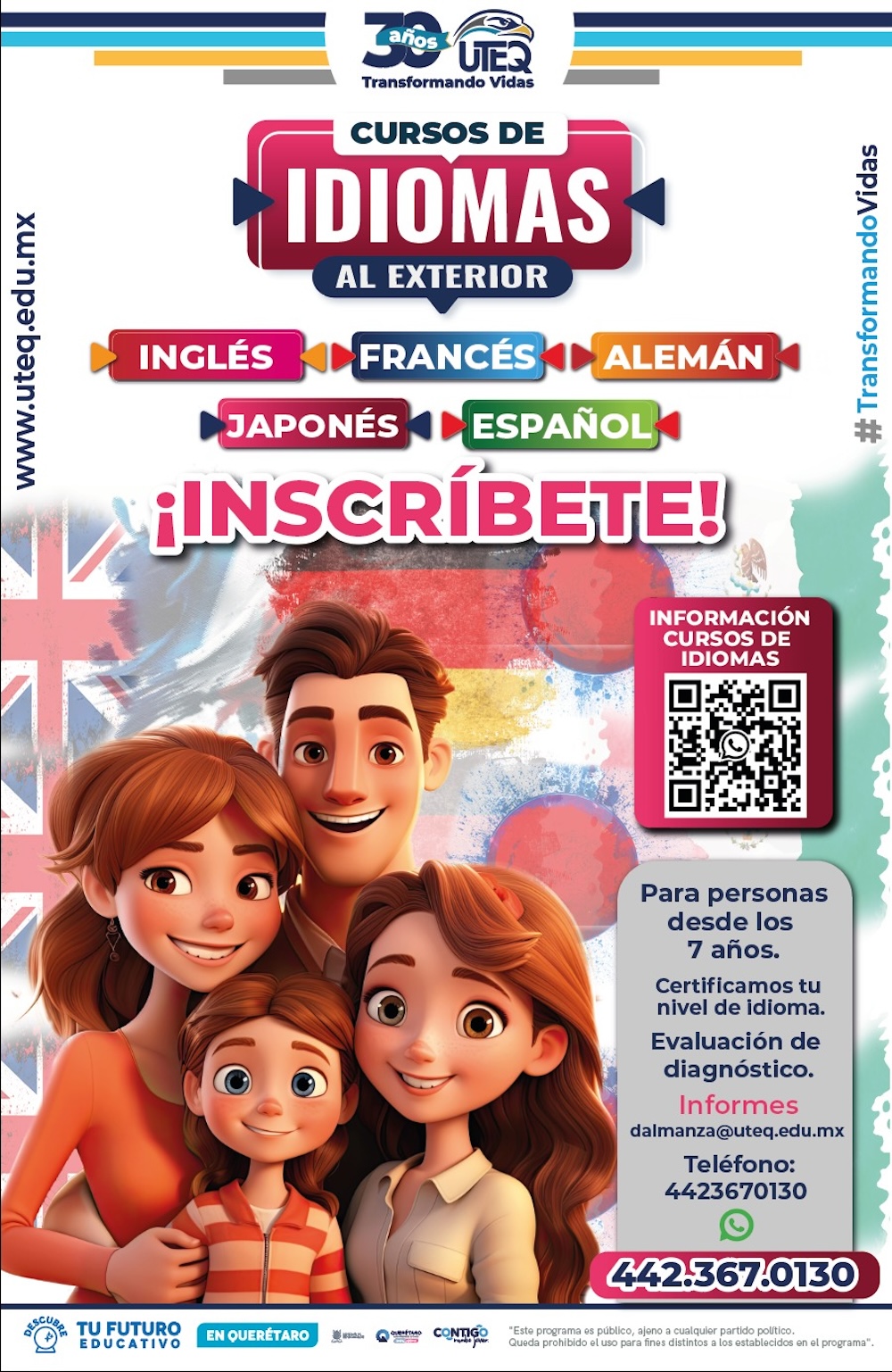 La Universidad Tecnológica de Querétaro (Uteq) mantiene abierta su convocatoria para los cursos de los idiomas: inglés, francés, alemán, japonés y español para extranjeros, hasta el 30 de agosto, mismo que consideran costos accesibles y son impartidos por instructores certificados en la enseñanza con resultados de alta calidad.