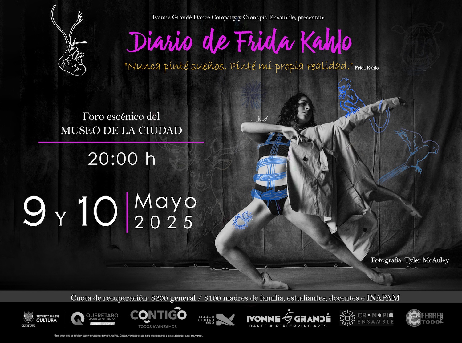La coreógrafa Ivonne Grandé, figura clave de la danza contemporánea en México y reconocida por su trabajo interdisciplinario de gran fuerza simbólica, conduce a un elenco de diez bailarines y bailarinas que encarnan el dolor, la libertad y la belleza que atraviesan la vida y obra de Kahlo, con un lenguaje escénico que emana potencia física, emoción contenida y exploración constante de lo femenino y lo poético.