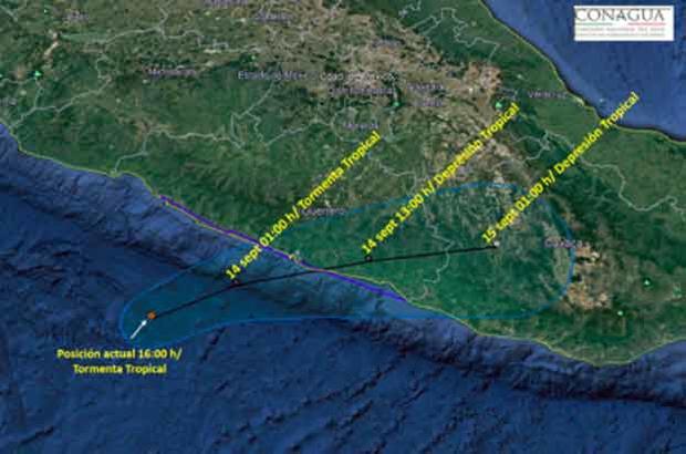 Alrededor de las 16:00 horas, se localizaba a 170 kilómetros al sur de Zihuatanejo y a 205 km al oeste-suroeste de Acapulco con vientos máximos sostenidos de 65 kilómetros por hora (km/h), rachas de 85 km/h y se desplaza hacia al este-noreste a 6 km/h.