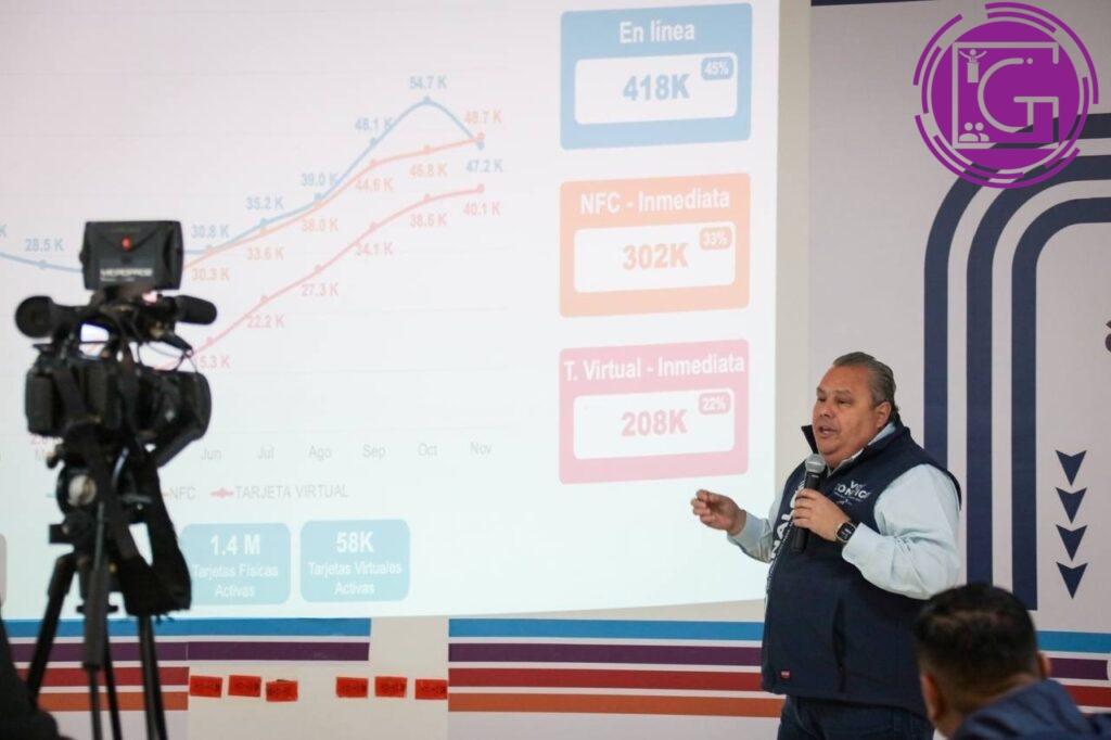 En este sentido, mencionó que de los 2.4 millones de recargas mensuales en promedio, se registró un incremento del 45 por ciento en las recargas en línea, con una recarga promedio de 40 pesos. De igual forma, afirmó que actualmente hay 1.4 millones de tarjetas físicas y 58 mil tarjetas virtuales activadas.