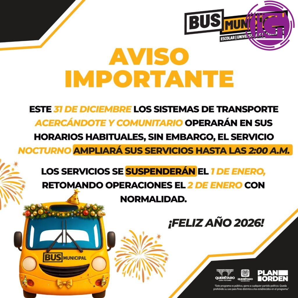 El municipio de Querétaro, a través de la Secretaría de Movilidad informa que, con el objetivo de facilitar los traslados de la ciudadanía a celebraciones con motivo de Año Nuevo, el Sistema de Transporte Nocturno Gratuito operará con horario ampliado este 31 de diciembre de 2025 hacia la madrugada del 1 de enero de 2026.