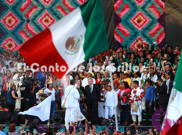 Los pueblos indígenas le hacen entrega del bastón de mando y lo alza ante los miles de asistentes frente a él, la gente grita de nuevo, ondea sus banderas, aplauden, corean su nombre “Obrador… Obrador…”, “Presidente… Presidente”, “No estas solo, no estas solo”, después le dan una bandera de los 500 pueblos indígenas de Norteamérica.