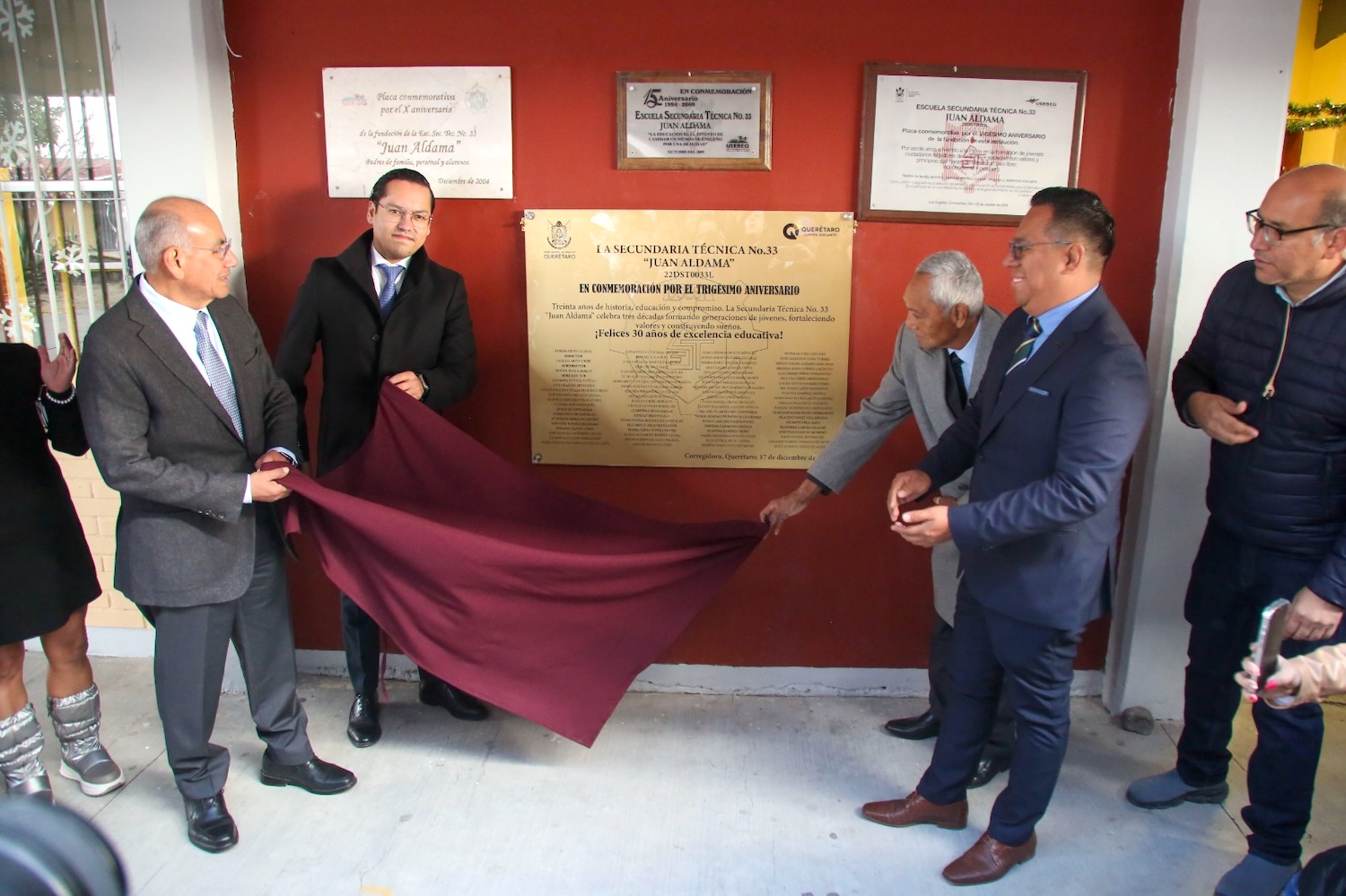 El presidente municipal de Corregidora, Chepe Guerrero, anunció la construcción de una aula-cocina para el próximo año en beneficio de los alumnos de la Escuela Secundaria Técnica número 33 “Juan Aldama” en la colonia Los Ángeles, donde develó una placa conmemorativa por el 30º aniversario.