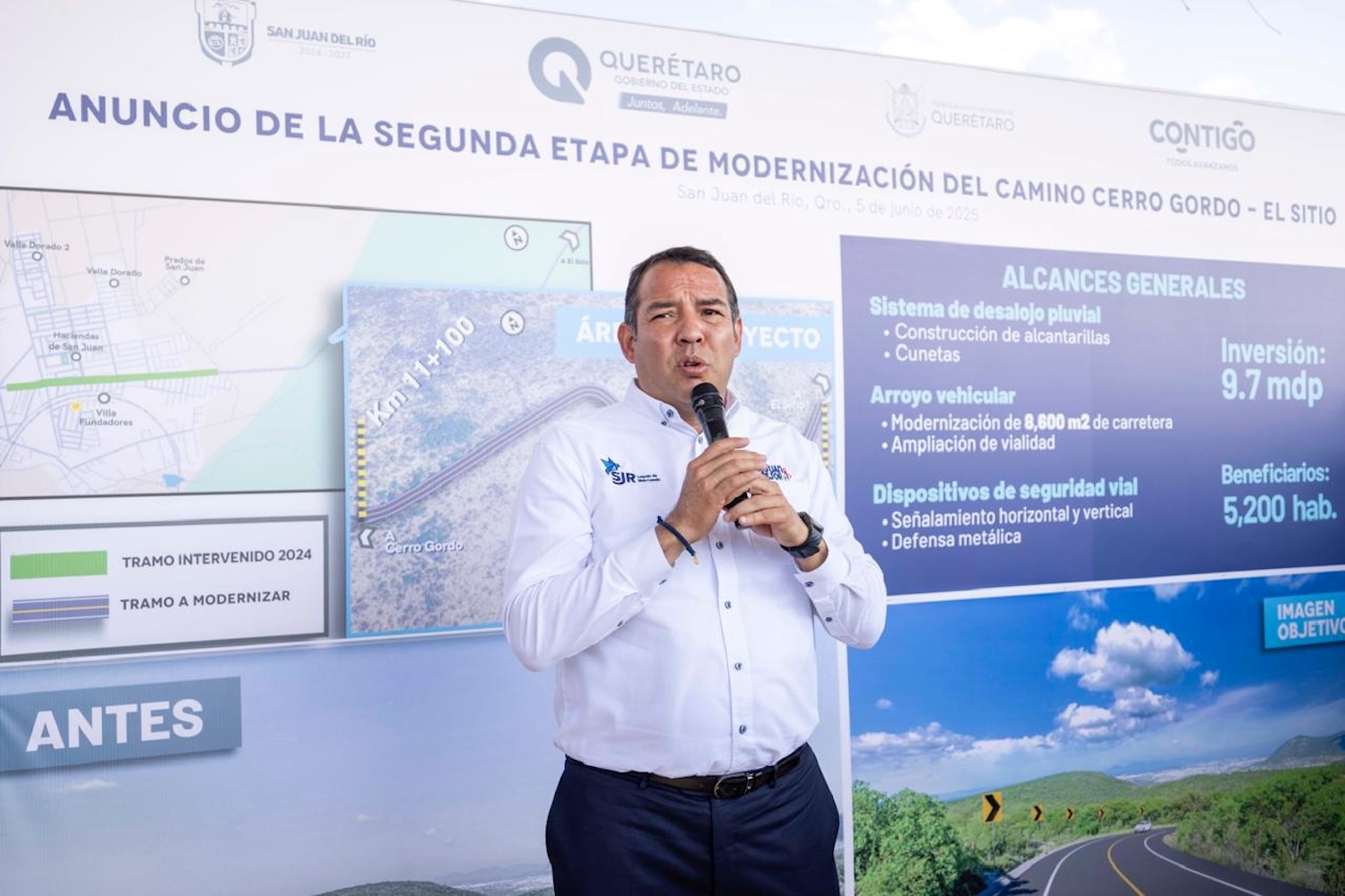 El gobernador, Mauricio Kuri González, anunció la segunda etapa del camino “Cerro Gordo-El Sitio” en el municipio de San Juan del Río, obra en la que se invertirán cerca de 10 millones de pesos para la modernización de ocho mil 600 metros cuadrados de carretera que beneficiará a más de cinco mil 200 habitantes.