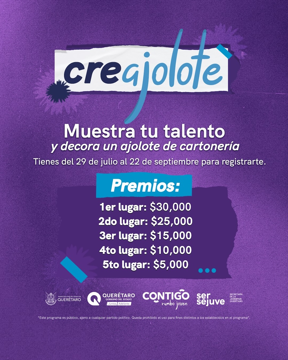 Con el objetivo de impulsar el talento de los jóvenes artistas plásticos de Querétaro, la Secretaría de la Juventud (Sejuve) lanzó la convocatoria “Creajolote” que consiste en la decoración de una pieza de cartonería en forma de ajolote que representa a “Juve”, la mascota de la dependencia.