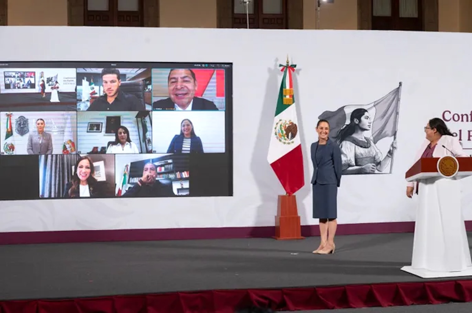 Durante la conferencia matutina, se realizó un enlace con los gobernadores de Oaxaca, Salomón Jara Cruz; de Nuevo León, Samuel García Sepúlveda; de Colima, Indira Vizcaíno Silva; de Baja California, Marina del Pilar Avila Olmeda; de Morelos, Margarita González Saravia; de Chiapas, Eduardo Ramírez Aguilar; de Puebla, Alejandro Armenta Mier; y de Guanajuato, Libia Denisse García Muñoz Ledo, quienes reafirmaron su compromiso de sumarse a las políticas de bienestar en favor de las mujeres.