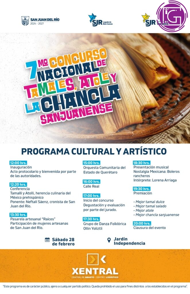 Para preservar, promover y proyectar la cocina tradicional mexicana, así como fortalecer la identidad culinaria de San Juan del Río, el gobierno municipal, presidido por el alcalde Roberto Cabrera Valencia, a través de la Coordinación de Desarrollo Económico, llevará a cabo el “7º Concurso Nacional de Tamales, Atole y la Chancla Sanjuanense” el próximo sábado 28 de febrero, a partir de las 12:00 horas, en el Jardín Independencia, en el Centro Histórico de la demarcación.