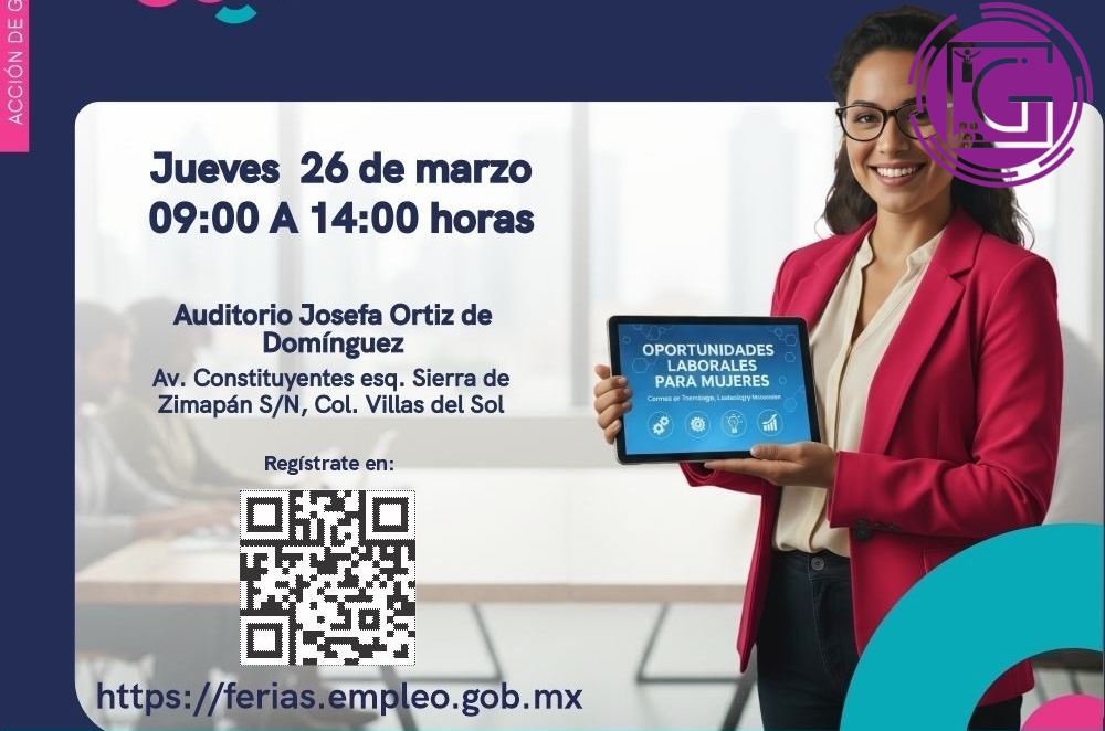 La Secretaría del Trabajo (ST) convoca a participar en la Feria Nacional de Empleo para las Mujeres Querétaro 2026, que se realizará el jueves 26 de marzo, de 09:00 a 14:00 horas, en el Auditorio Josefa Ortiz de Domínguez, donde 50 empresas ofertarán más de mil vacantes en los sectores industrial y de servicios, dirigidas a personas con escolaridad desde primaria hasta licenciatura, con sueldos que van hasta los 50 mil pesos mensuales.