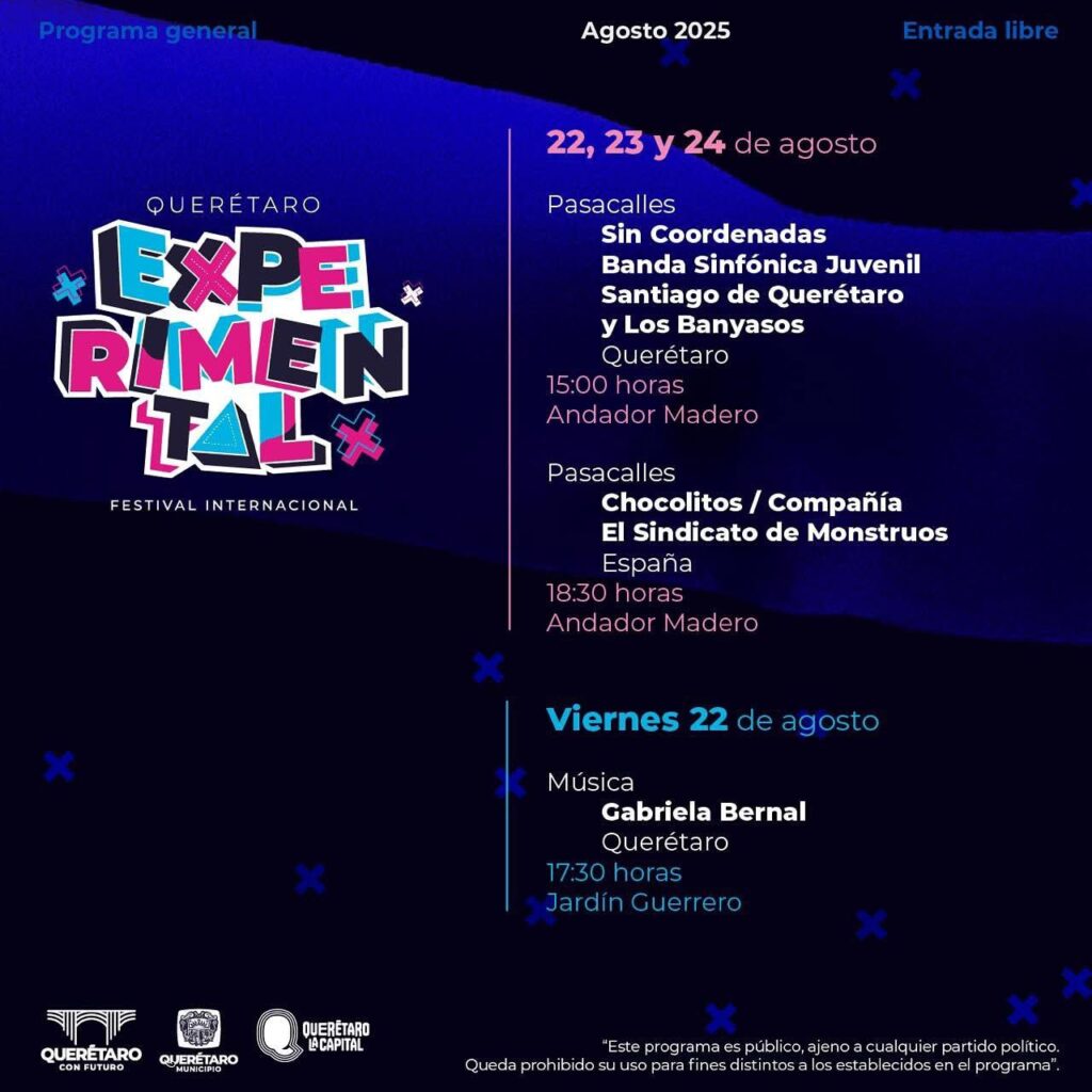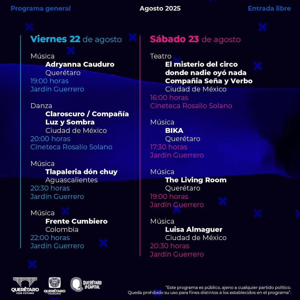 El programa del festival inicia este viernes 22 de agosto con el pasacalles Sin Coordenadas, a cargo de la Banda Sinfónica Juvenil Santiago de Querétaro y Los Banyasos, a las 15:00 horas en el Andador Madero. Se trata de un recorrido acrobático con música en vivo y malabares que desafían la gravedad, mismo que también se presentará el sábado y domingo en el mismo horario. En este espacio también se presentará el segundo pasacalles Chocolitos de la compañía española Sindicato de los Monstruos, un espectáculo familiar protagonizado por dos personajes con trajes articulados que ofrecen movimientos realistas y fantásticos, con un mensaje sobre el cuidado ambiental, programado para viernes, sábado y domingo a las 18:30 horas. En la disciplina de danza destaca Claroscuro de la Compañía Luz y Sombra, una obra coreográfica que aborda la luz y la oscuridad, el duelo y la esperanza, el dolor y el placer, programada a las 20:00 horas en la Cineteca Rosalío Solano.