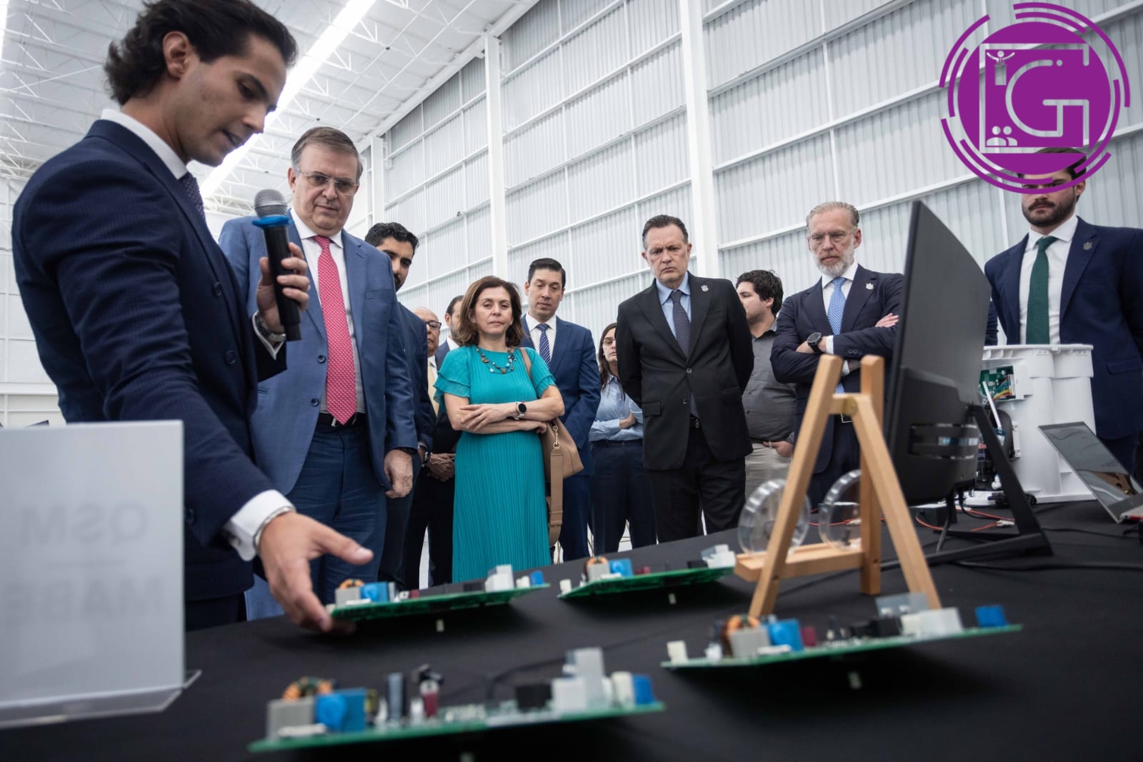 El gobernador, Mauricio Kuri González, acompañado del secretario de Economía Federal, Marcelo Ebrard Casaubón, recorrieron las instalaciones de la primera fábrica QSM Semiconductores en México, la cual está instalada en el Parque Industrial Tecnológico Innovación, en la comunidad de El Rosario, en el municipio de El Marqués.
