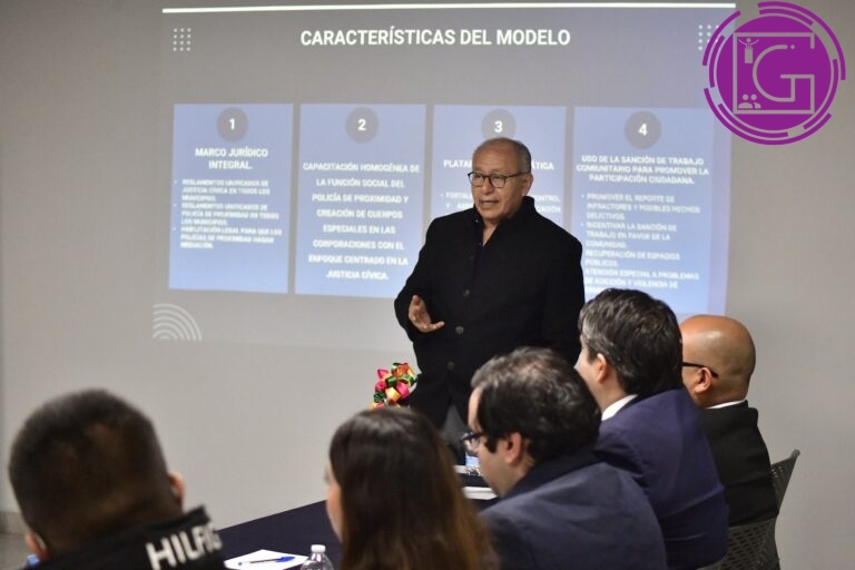 Durante la jornada de trabajo en el Centro de Información y Análisis para la Seguridad (CQCIAS), Juan Martín Granados Torres, asesor en políticas públicas, presentó el Modelo de Justicia Cívica como una política pública impulsada por el gobernador Mauricio Kuri González, orientada a fomentar la cultura cívica, la participación comunitaria y la solución pacífica de conflictos.