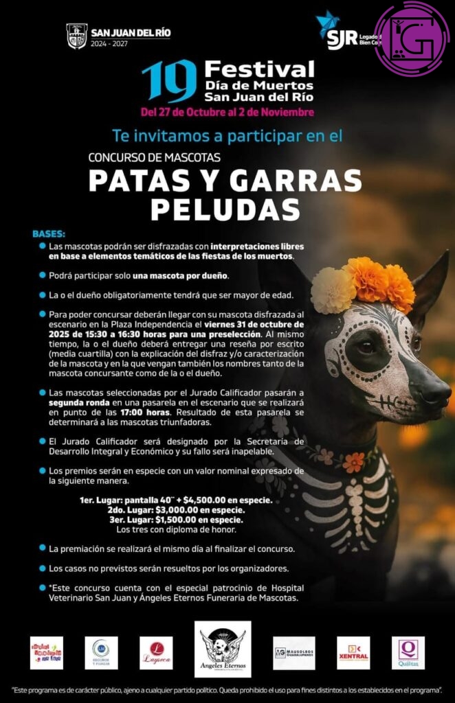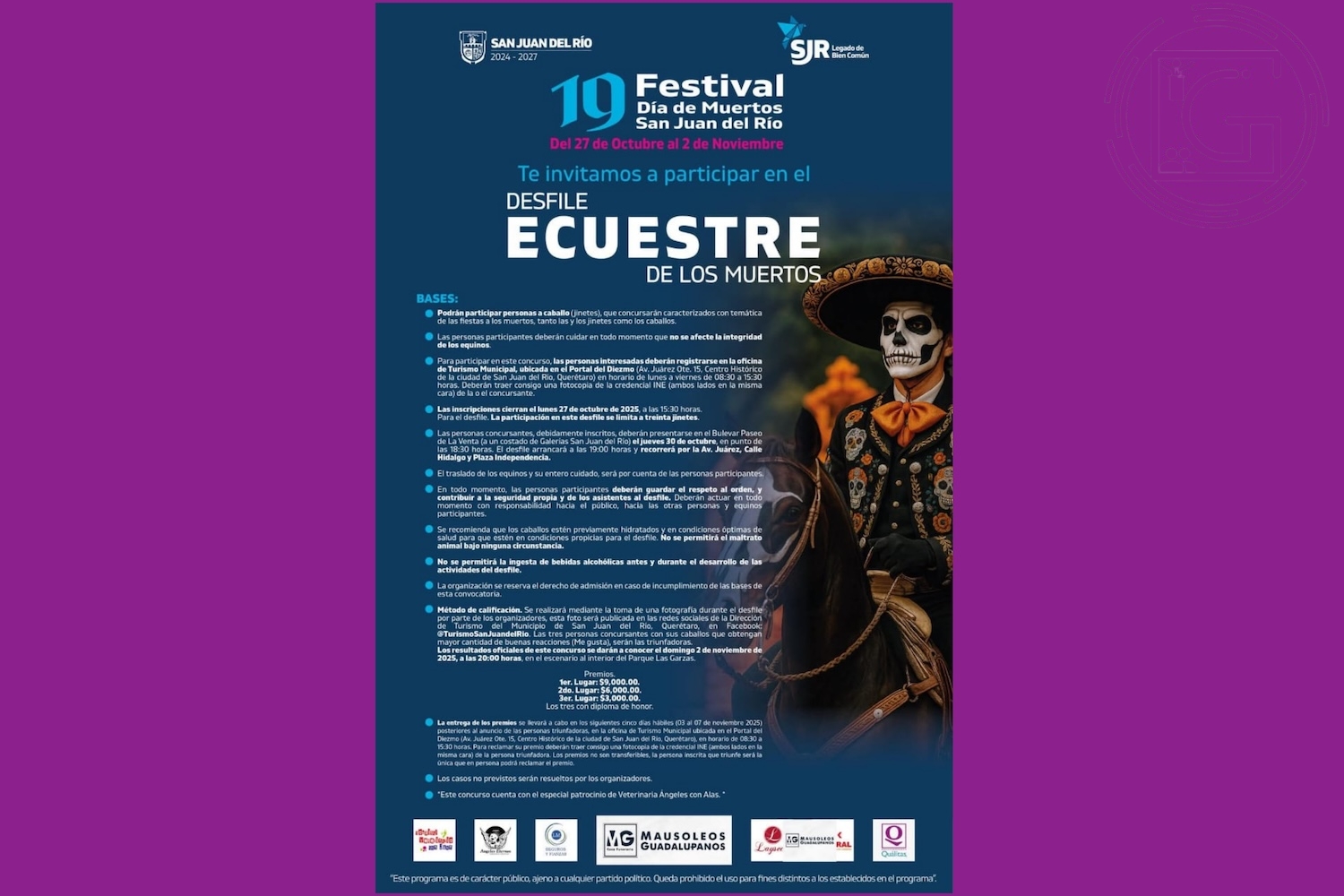 Como parte de las actividades del 19º Festival de Día de Muertos San Juan del Río 2025, este jueves 30 de octubre, a las 18:30 horas, se llevará a cabo el “Desfile y Concurso Ecuestre de los Muertos”, en el que podrán participar jinetes y caballos caracterizados bajo la temática de la celebración de muertos en México, cuyas inscripciones cierran el lunes 27 de octubre a las 15:30 horas.