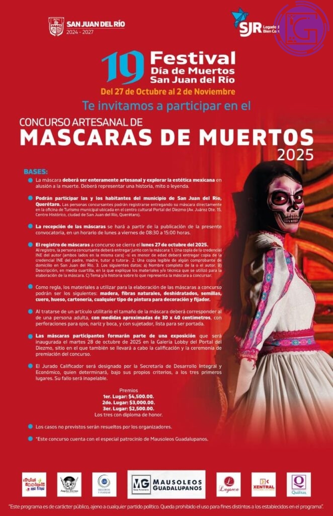 También incluye el “Concurso Artesanal de Máscaras de Muertos 2025”, cuyo registro –que se realiza con la entrega de la máscara en la Oficina de Turismo, ubicada en el Portal del Diezmo– cierra el lunes 27 de octubre. Las máscaras participantes serán una parte de una exposición que será inaugurada el martes 28 de octubre en el Portal del Diezmo, donde se calificarán y premiarán. El primer lugar ganará 4 mil 500 pesos, el segundo 3 mil y el tercero 2 mil 500 pesos.