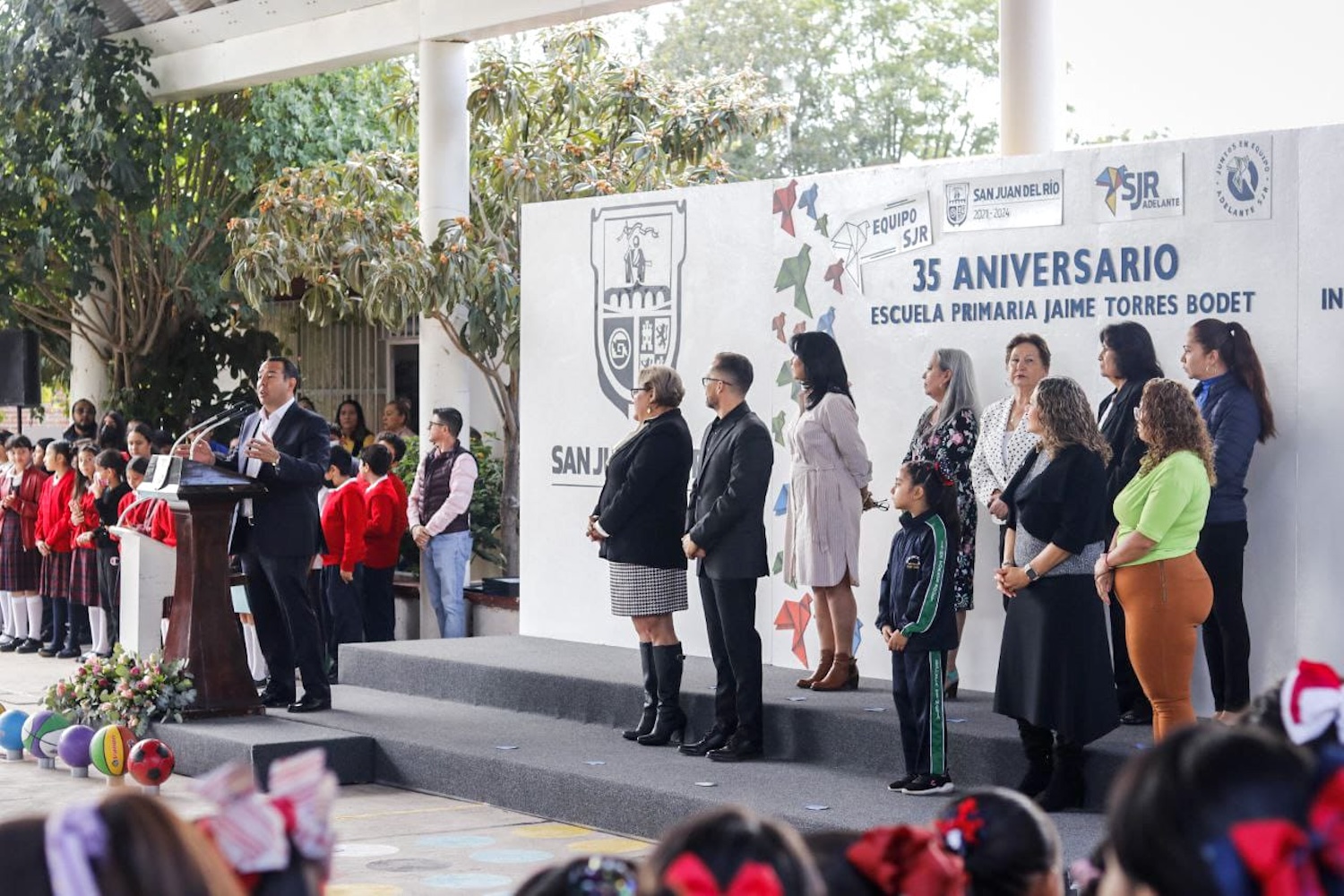 El presidente municipal de San Juan del Río, Roberto Cabrera Valencia, encabezó la ceremonia del 35º aniversario de la escuela primaria Jaime Torres Bodet, ubicada en Infonavit San Isidro, donde destacó que la comunidad escolar de este centro educativo ha sido parte de la construcción de la sociedad, además, afirmó, son pieza clave en los pilares de la calidad de vida de San Juan del Río.