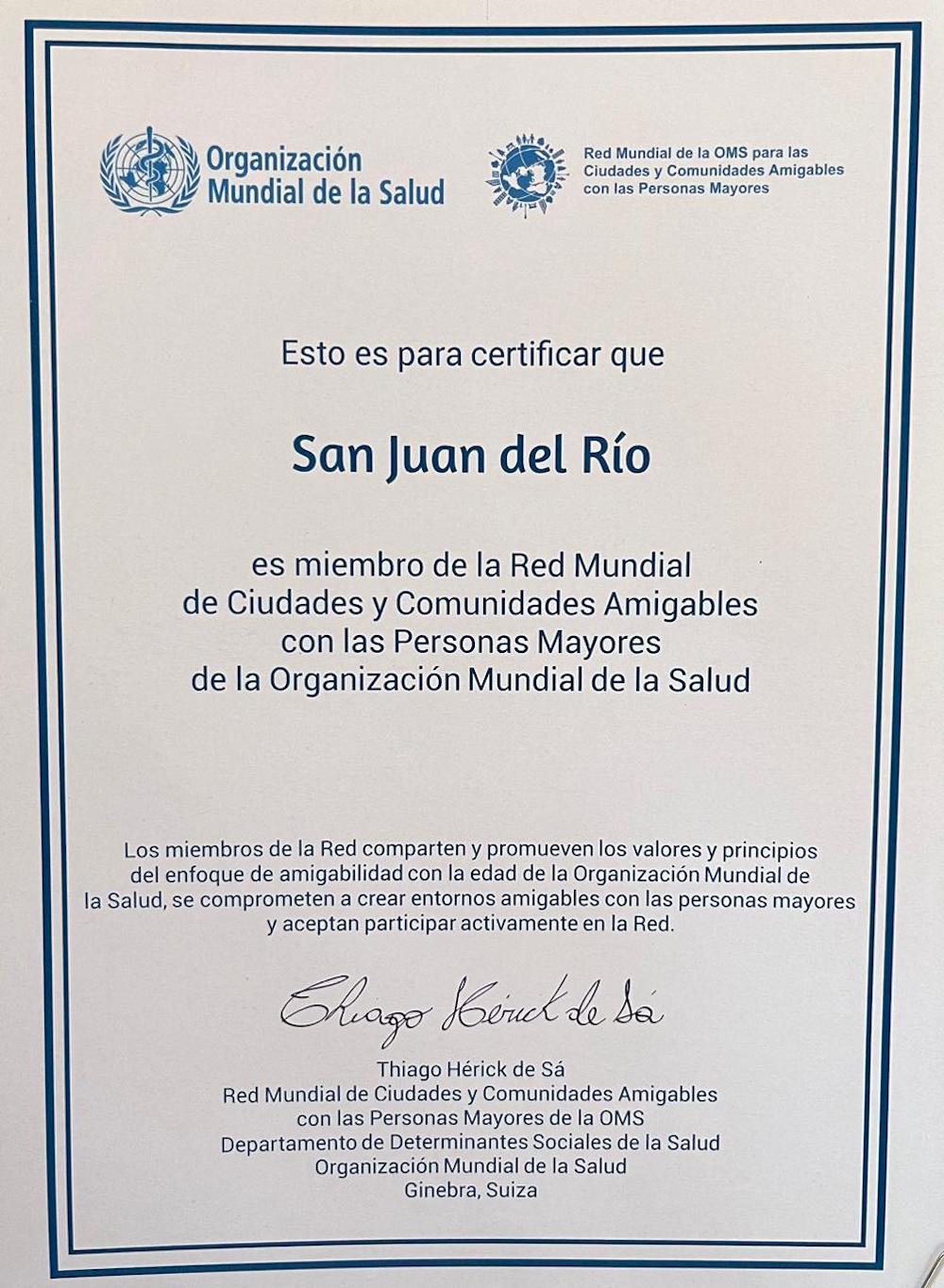 El municipio de San Juan del Río ha sido aceptado y certificado como miembro de la Red Mundial de la OMS para las Ciudades y Comunidades Amigables con las Personas Mayores, lo anterior en el marco de la Segunda Reunión Ordinaria de la Red Queretana de Municipios por la Salud 2023.