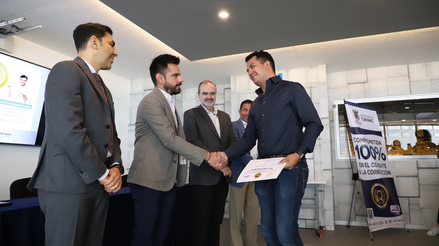 Empleados y colaboradores de la Secretaría de Turismo del estado de Querétaro (Sectur), recibieron la certificación Servidores Públicos Anticorrupción, de manos de autoridades estatales y federales, encabezadas por el Auditor Superior del estado de Querétaro, Enrique de Echávarri Lari; el director administrativo de la Secretaría de Turismo Estatal (Sectur), Cristofer Merlos Montes; el secretario técnico del Sistema Nacional Anticorrupción, Roberto Moreno Herrera.