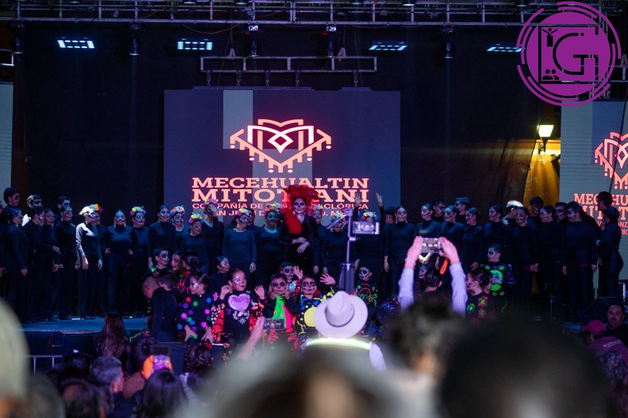 En el marco del 19º Festival de Día de Muertos San Juan del Río 2025, la Compañía de Danza Folklórica Mecehualtin Mitotiani realizó la presentación del espectáculo “Fiesta en el Mictlán” en la Plaza Independencia, evento que fue presenciado por los sanjuanenses que, en un ambiente festivo y familiar, disfrutaron cada uno de los actos que formaron parte de esta presentación.