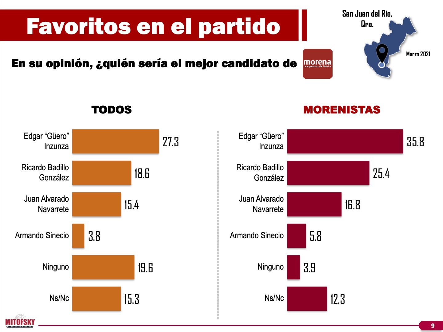Dicha encuesta o estudio de opinión se realizó el 6 y 7 de marzo pasados a 600 personas mayores de 18 años residentes en el municipio sanjuanense, y en la pregunta: “En su opinión, ¿quién sería el mejor candidato de Morena?”, el “Güero” Inzunza obtiene el 27.3% en general, pero el 35.8% entre los militantes morenistas del municipio.