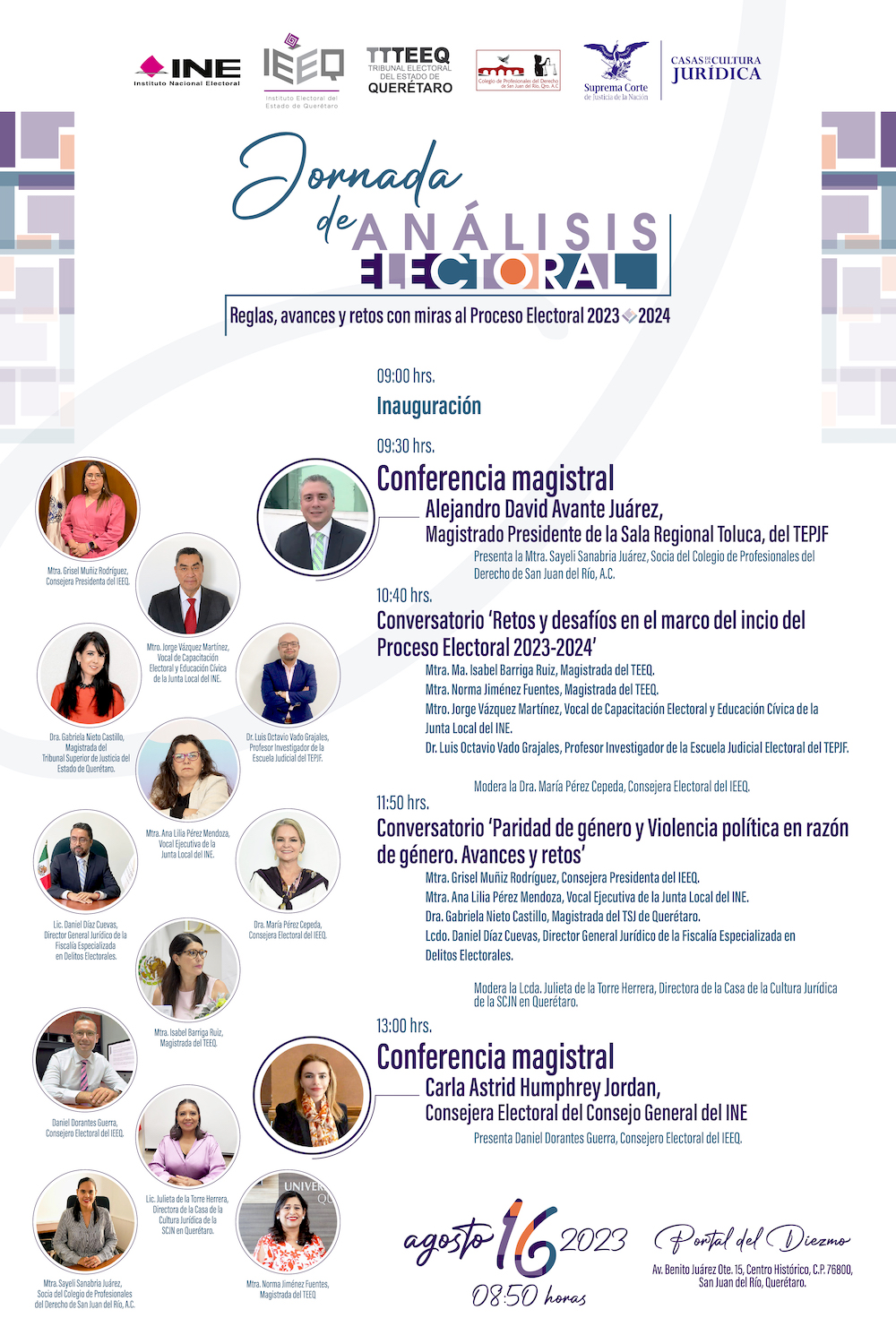 El Instituto Electoral del Estado de Querétaro (IEEQ), la Suprema Corte de Justicia de la Nación, el Instituto Nacional Electoral (INE), el Tribunal Electoral del Estado de Querétaro (TEEQ) y el Colegio de Profesionales del Derecho de San Juan del Río, Querétaro, A.C., anunciaron la realización de la “Jornada de análisis electoral. Reglas, avances y retos con miras al Proceso Electoral 2023-2024”, el próximo 16 de agosto en el Portal del Diezmo ubicado en el municipio de San Juan del Río, Querétaro.