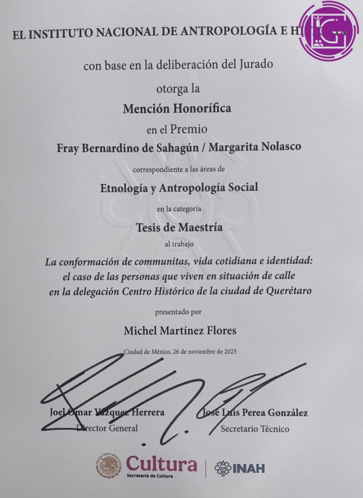 La estudiante de Maestría en Estudios Antropológicos en Sociedades Contemporáneas, de la Facultad de Filosofía (FFi) de la Universidad Autónoma de Querétaro (UAQ), Michel Martínez Flores obtuvo mención honorífica en el Premio INAH 2025, impulsado por el Instituto Nacional de Antropología e Historia (INAH), por “La conformación de communitas, vida cotidiana e identidad: el caso de personas que viven en situación de calle en la delegación Centro Histórico”.