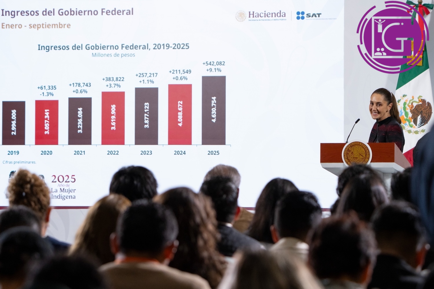 La presidenta de México, Claudia Sheinbaum Pardo, resaltó que la recaudación de enero a septiembre de 2025 asciende a los 4.6 billones de pesos (bdp), lo que representa 542 mil millones de pesos (mdp) más que en 2024, lo cual demuestra que los mexicanos tienen confianza en que los recursos se utilizan de manera transparente y honesta.