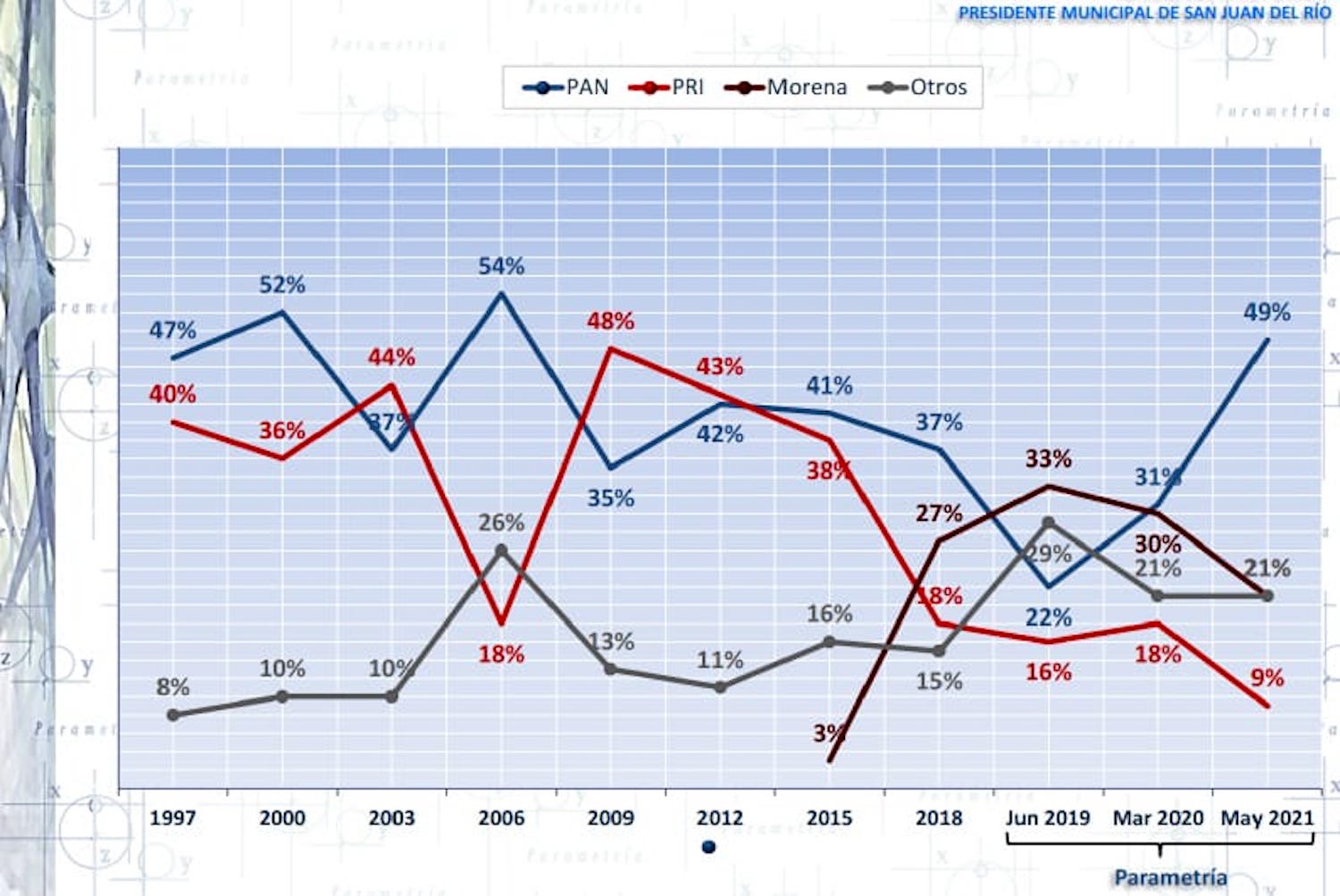 Lo cierto es que San Juan del Río, con alternancias consecutivas a partir del año 2000, demostró un comportamiento electoral bipartidista; lo que explica Francisco Abundis, director de Parametría, es que PRI y Morena son lo mismo, por supuesto, a la luz del cálculo estadístico.