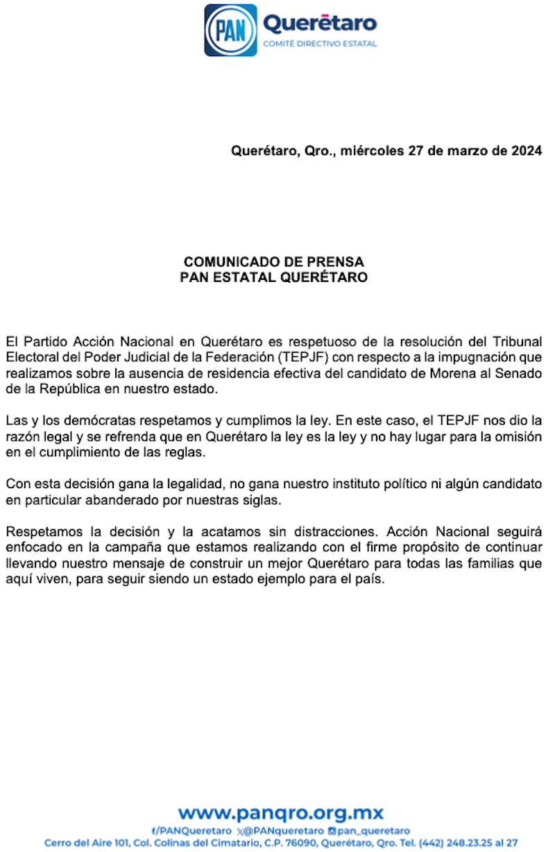 “Se refrenda que en Querétaro la ley es la ley y no hay lugar para la omisión en el cumplimiento de las reglas”, señala en comunicado la dirigencia estatal del Partido Acción Nacional (PAN), tras la resolución del tribunal electoral de anular la candidatura de Santiago Nieto al Senado de la República.