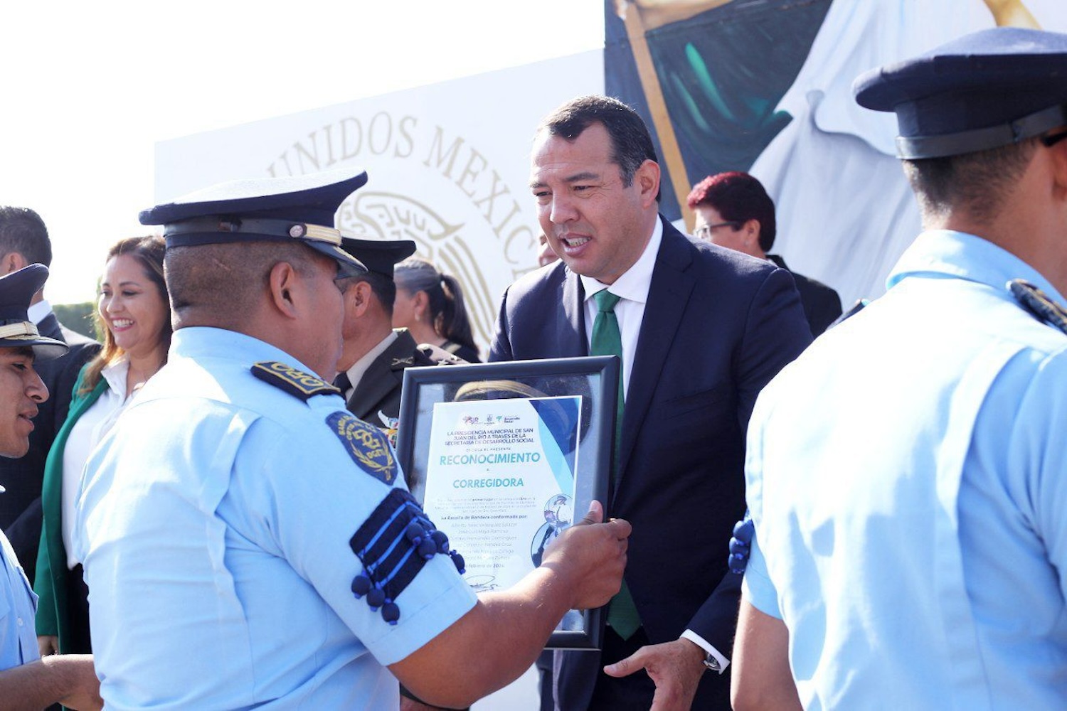 Durante el acto cívico, el alcalde sanjuanense –junto con los titulares de las dependencias, integrantes que conforman el Ayuntamiento de San Juan del Río, y el segundo comandante Arma Brindada del Séptimo Regimiento de La Llave, Jorge Martínez Jacabo– entonó el Himno Nacional Mexicano e izó la bandera con honor y respeto, para después continuar con los nombramientos y la entrega de reconocimientos a las escoltas ganadoras por el XXIII Concurso Municipal de Escoltas de Bandera, así como a instructores de estas actividades.