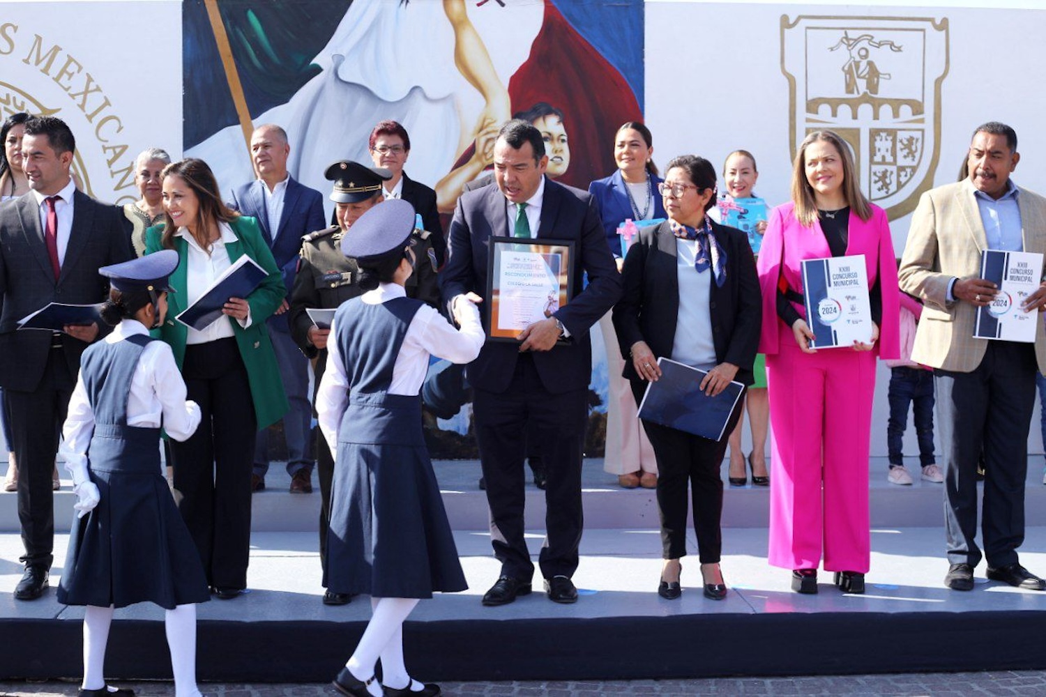 El presidente municipal, Roberto Cabrera Valencia, en equipo con autoridades municipales, encabezó este sábado la ceremonia con motivo del Día de la Bandera, en la cual también se entregaron reconocimientos a las escoltas ganadoras del concurso municipal que arrancó el 21 de febrero.