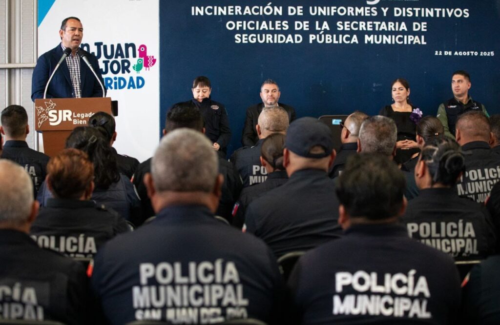 “Qué bueno que es San Juan del Río y que tenga esta policía municipal. Hoy, de manera especial, es un evento de incineración de uniformes y distintivos oficiales de la Secretaría de Seguridad Pública Municipal y por eso, acompañados de un Honorable e Histórico Cuerpo de Bomberos, acompañados de Protección Civil Municipal, pues les reitero, de verdad, que sigamos por ese camino. Les exhorto, les agradezco y les reconozco lo que están haciendo todos los días por nuestras familias, por San Juan, poniendo el ejemplo desde Querétaro para todo México”, dijo Cabrera Valencia.