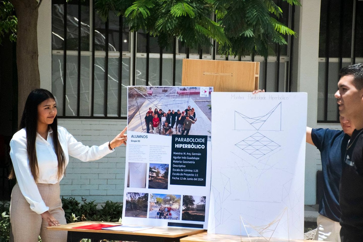 En un tercer momento, expusieron los volúmenes de edificios emblemáticos de Querétaro, práctica con la que demostraron su capacidad para analizar y replicar estructuras arquitectónicas significativas, utilizando los principios de la geometría descriptiva. Para finalizar, presentaron un paraboloide hiperbólico a escala real y habitable, el cual destacó por su complejidad y aplicabilidad en la arquitectura moderna.