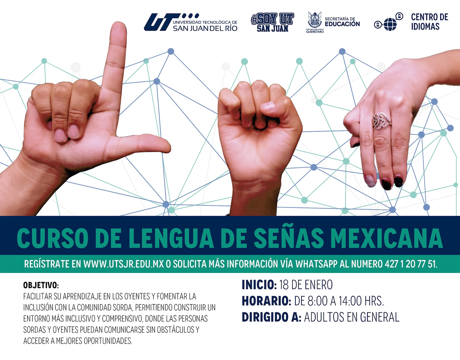 El Centro de Idiomas (CIUT) de la Universidad Tecnológica de San Juan del Río impartirá a partir del 18 de enero el Curso Lengua de Señas Mexicana que busca facilitar su aprendizaje en los oyentes y fomentar la inclusión, permitiendo construir un entorno más inclusivo y comprensivo, donde las personas sordas y oyentes puedan comunicarse sin obstáculos y acceder a oportunidades profesionales en el campo de la interpretación o en organizaciones enfocadas en personas sordas.