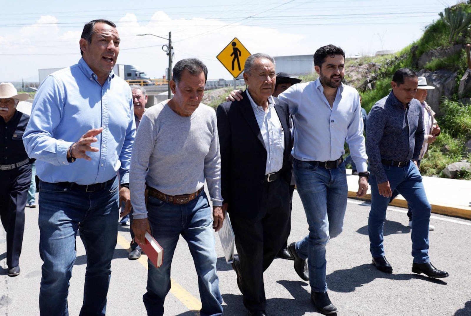 El presidente municipal de San Juan del Río, Roberto Cabrera Valencia, en compañía del senador de la República por Querétaro, Agustín Dorantes Lámbarri, y el director de la Junta de Agua Potable y Alcantarillado Municipal (JAPAM), Toño Pérez Cabrera, entregaron la reubicación de la red de agua potable y drenaje sanitario en la comunidad de Palmillas, donde también inauguraron el puente vehicular de la carretera federal 57.