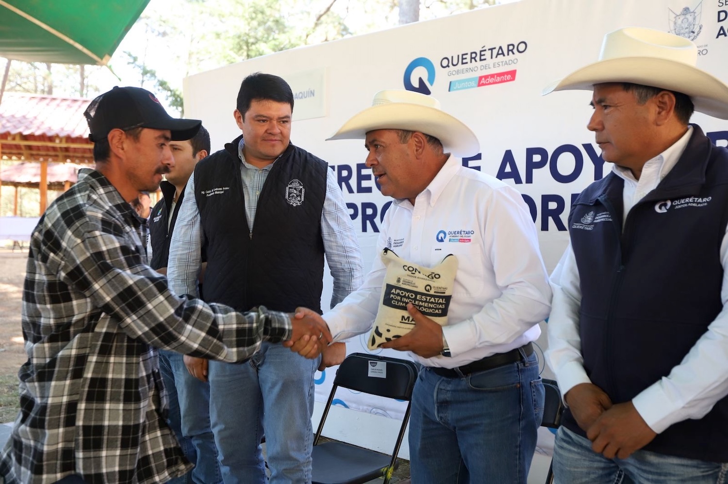 El secretario de Desarrollo Agropecuario, Rosendo Anaya, encabezó en San Joaquín la dispersión por parte del gobierno del estado de 47 toneladas de maíz para consumo humano, como apoyo emergente a 303 productores y sus familias, quienes sufrieron afectación en hectáreas de siembra de temporal y que vieron mermada su cosecha por la sequía prolongada.