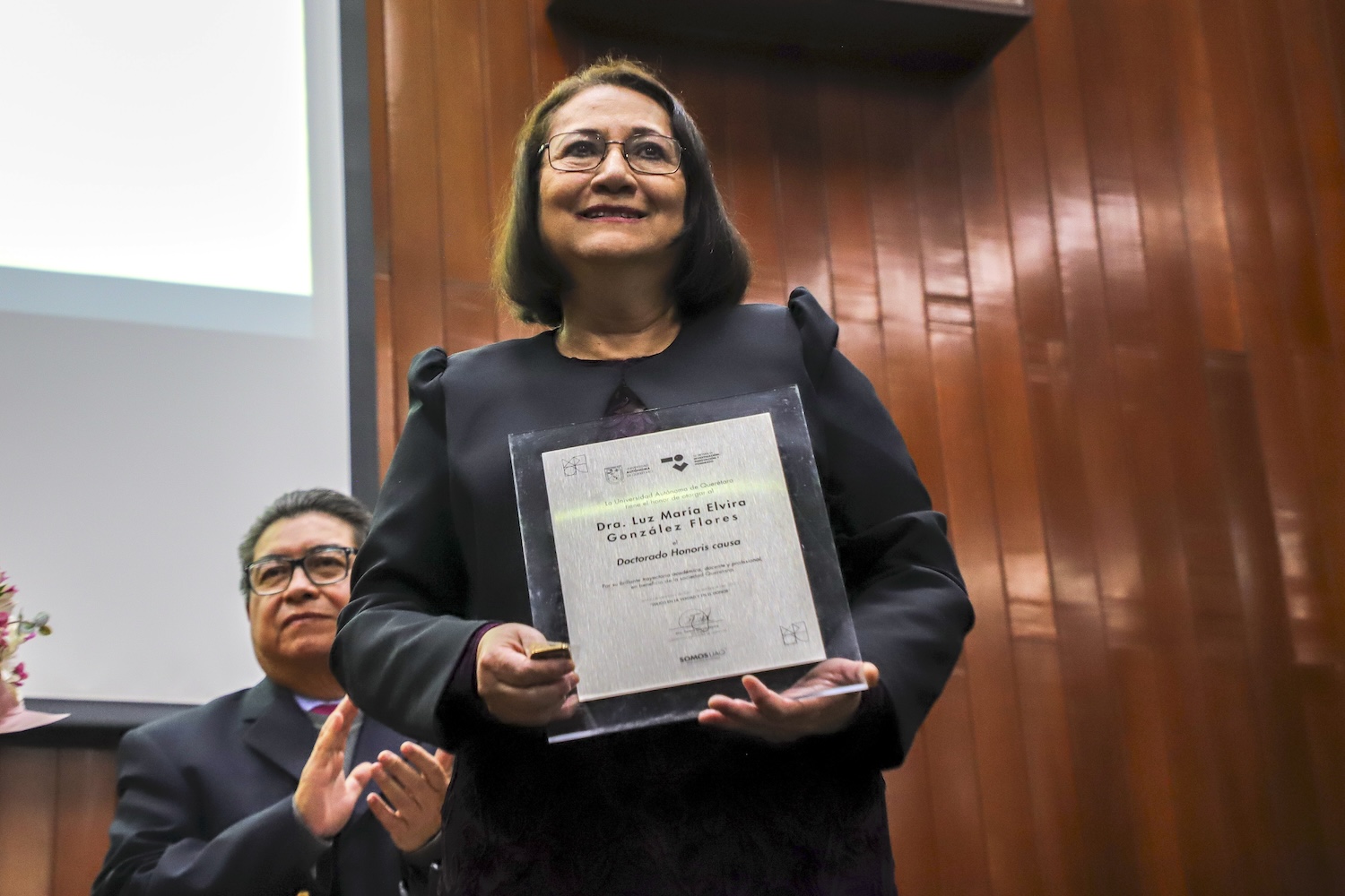 Por otro lado, Ma. Guadalupe Flavia Loarca Piña, secretaria de Investigación y Posgrado de la UAQ, reseñó la trayectoria de Luz María Elvira González Flores, quien posteriormente agradeció esta distinción y aseguró que la UAQ ha avanzado de manera importante, tiene muchos programas de gran calidad y oportunidades de talla nacional e internacional para estudiantes, por lo que es notable su crecimiento en todos los sentidos.