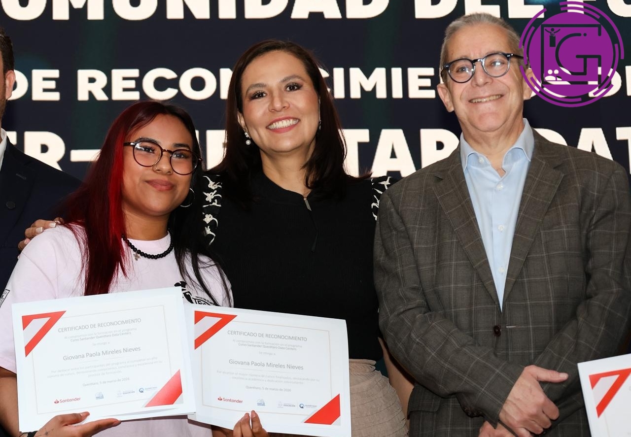 La secretaria de Educación, Martha Soto, realizó la entrega de reconocimientos a los estudiantes que participaron en el programa “Santander Querétaro Data Centers 2025”, en coordinación con Santander Open Academy, y que concluyó con seis mil 722 cursos enfocados en fortalecer el talento digital.