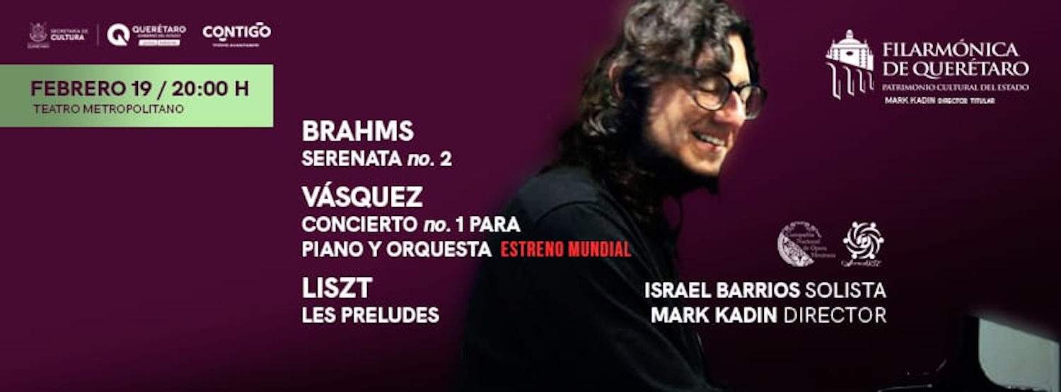 La Orquesta Filarmónica del Estado de Querétaro (OFEQ), bajo la batuta del maestro Mark Kadin, presentará el miércoles 19 de febrero, en el Teatro Metropolitano, el estreno mundial y la grabación del “Concierto número 1 para piano y orquesta”, del destacado compositor mexicano José F. Vásquez.