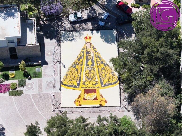 La creación de este mosaico se remonta a 2013, cuando los artesanos decidieron unir esfuerzos para representar la imagen de la Virgen a través de una técnica tradicional; si se unieran longitudinalmente las piezas, medirían 360 kilómetros.