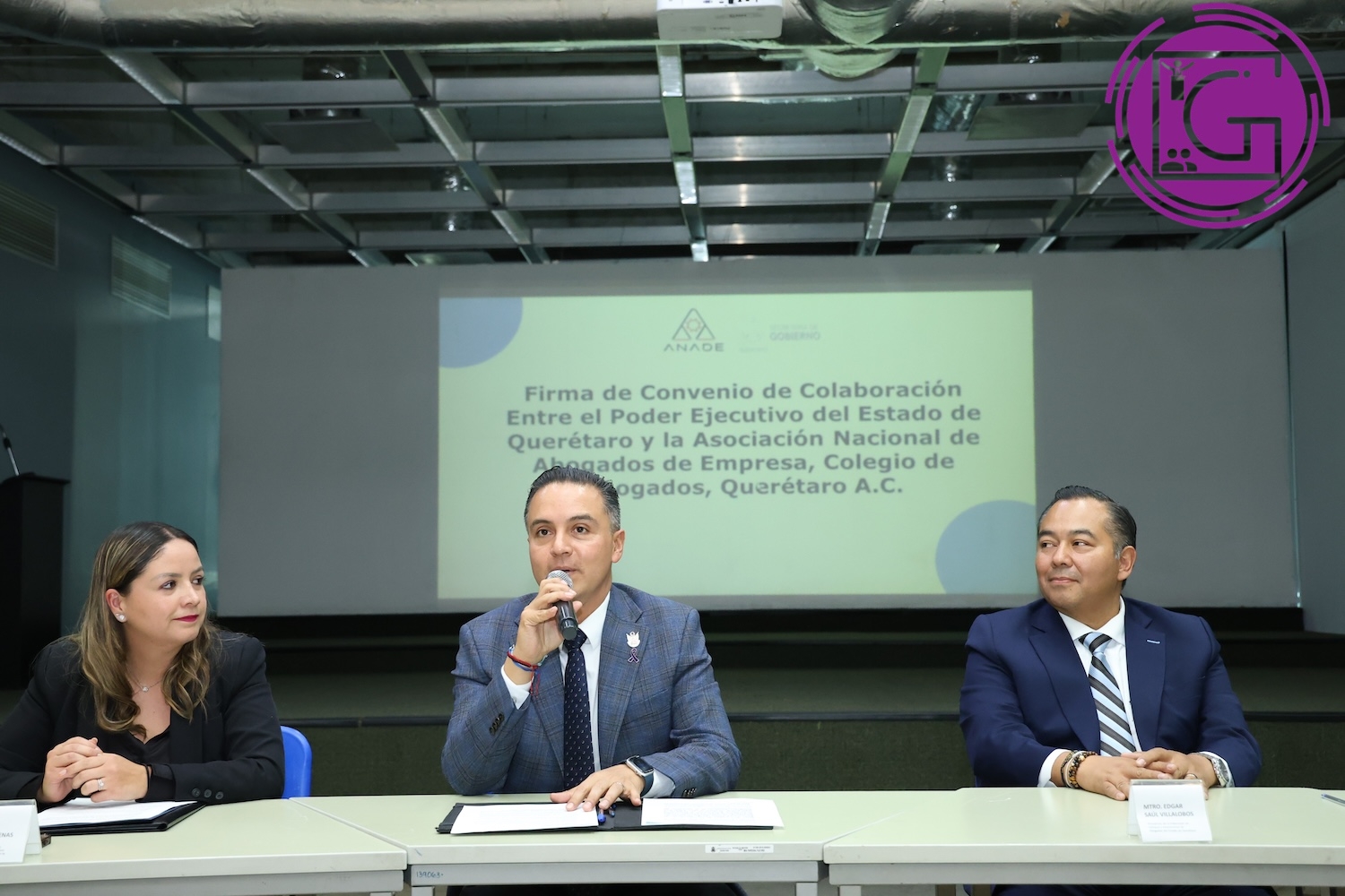 Con el propósito de generar una alianza entre el sector público y el gremio jurídico organizado, orientado a posicionar el conocimiento profesional al servicio de quienes más lo necesitan, el secretario de Gobierno, Éric Gudiño Torres, encabezó la firma de un convenio de colaboración con la Asociación Nacional de Abogados de Empresa (ANADE), Colegio de Abogados Querétaro A. C., presidido por Diana Lorena Arenas Saldaña.