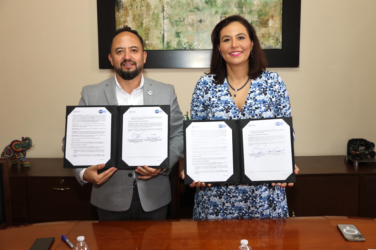 La titular de la Secretaría de Educación del Estado de Querétaro (Sedeq), Martha Elena Soto Obregón, y su homólogo de Guanajuato (SEG), Jorge Enrique Hernández Meza, firmaron una carta de intención para compartir estrategias encaminadas a fortalecer a los estudiantes y promover la permanencia escolar, optimizando así las estrategias educativas y fomentando un desarrollo más integral desde las primeras etapas de la educación.
