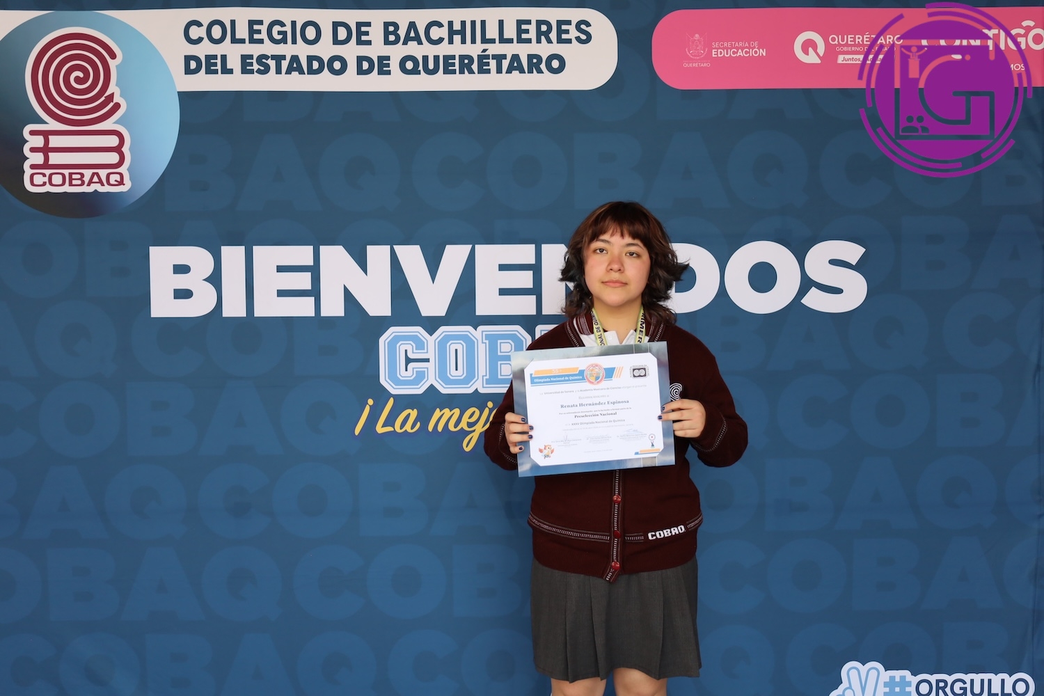 Renata Hernández Espinosa, estudiante de cuarto semestre del Colegio de Bachilleres del Estado de Querétaro (Cobaq), plantel 5, ubicado en Cadereyta, obtuvo medalla de oro en la XXXV Olimpiada Nacional de Química 2026, realizada del 10 al 14 de abril en Hermosillo, Sonora.