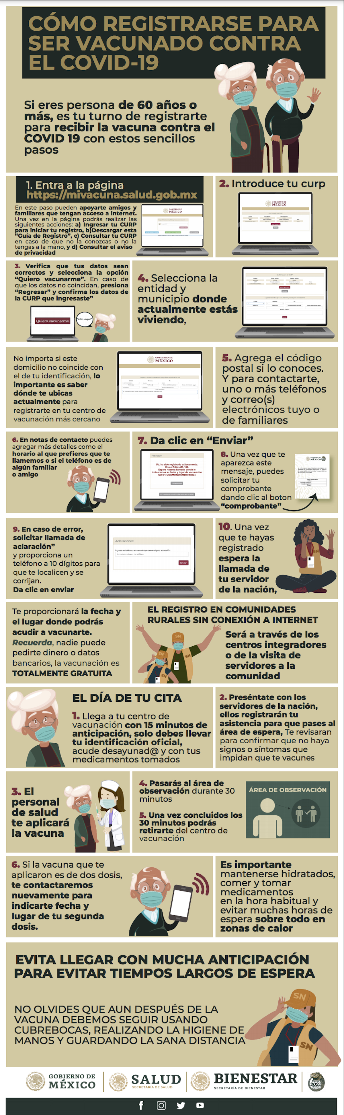 Con el objetivo de continuar el ciclo de vacunación contra el virus Sars-Cov-2 causante de la enfermedad Covid-19 a las personas adultas mayores de 60 años o más, el Gobierno de México dispuso la plataforma de registro https://mivacuna.salud.gob.mx.