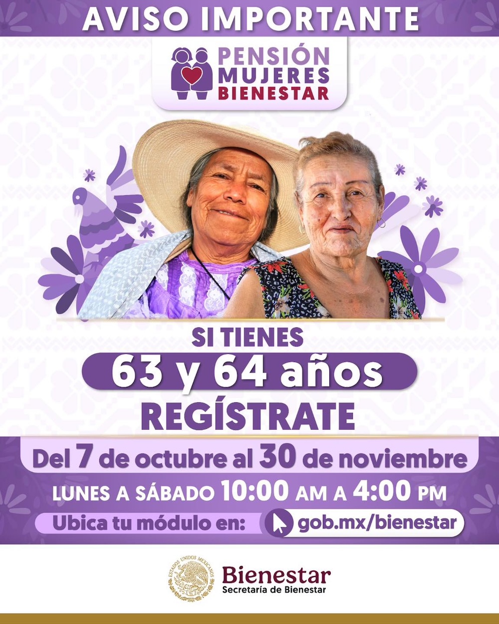 Precisó que por instrucción de la presidenta Claudia Sheinbaum, el registro a la Pensión Mujeres Bienestar continúa hasta el 30 de noviembre; en 2025 las mujeres de 63 a 64 años y de 60 a 64 años que vivan en municipios con alta presencia de población indígena o afromexicana, recibirán la pensión de tres mil pesos bimestrales de manera directa y sin intermediarios a través de la tarjeta del Banco del Bienestar.