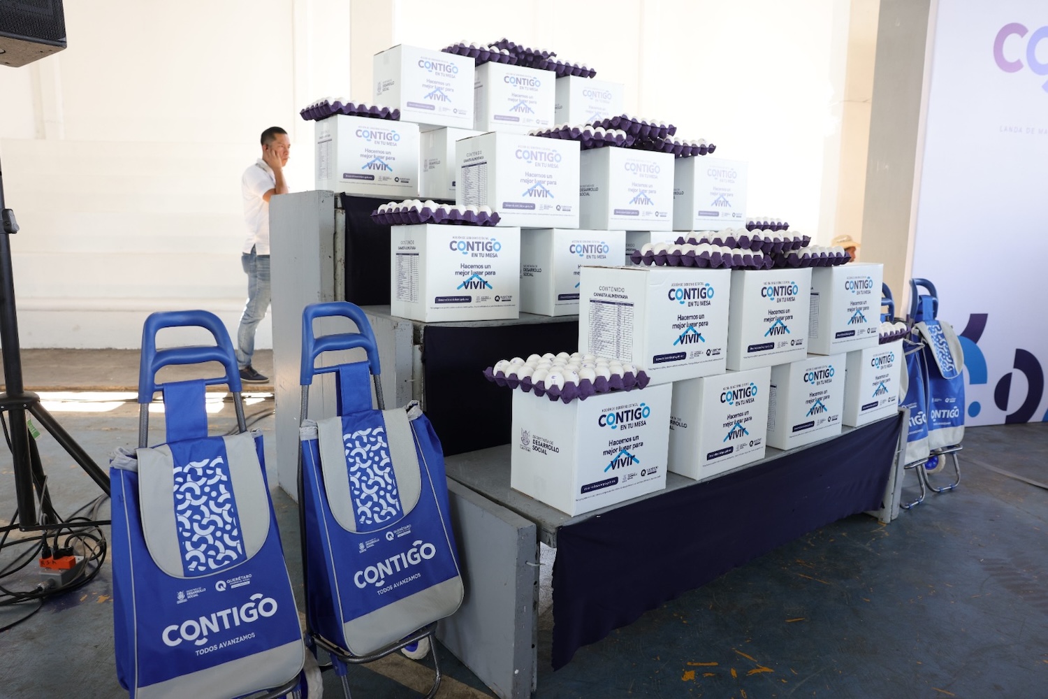 En su mensaje, el titular de la Secretaría de Desarrollo Social del Estado de Querétaro (Sedesoq), Luis Nava, expresó que la canasta básica del programa se reforzó este año, y aumentó de 14 a 25 productos, entre los que destacan: café, azúcar, sal, harina de maíz, harina de trigo, aceite, leche, galletas, huevos, frijoles, así como artículos de higiene personal, y productos de limpieza básica.