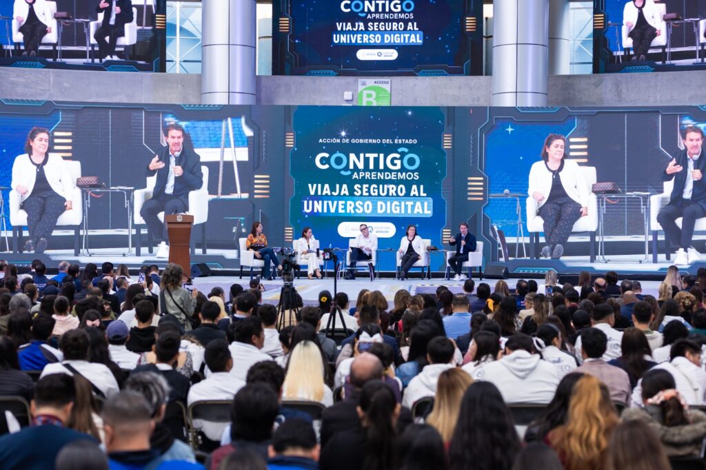 La funcionaria moderó un conversatorio con el gobernador e invitados especiales como la economista, exsecretaria de Educación Pública y promotora de Civismo Digital, Josefina Vázquez Mota; el presidente de la Fundación Teletón, filántropo y promotor de Derechos Humanos, Fernando Chobi Landeros; y la académica investigadora internacional, especialista en Alfabetización Digital, Redes Sociales Seguras y Prevención del Cyberbullying, Marcela Momberg, para tratar distintos aspectos de las tecnologías, uso de dispositivos y responsabilidad de los padres, madres de familia y docentes.