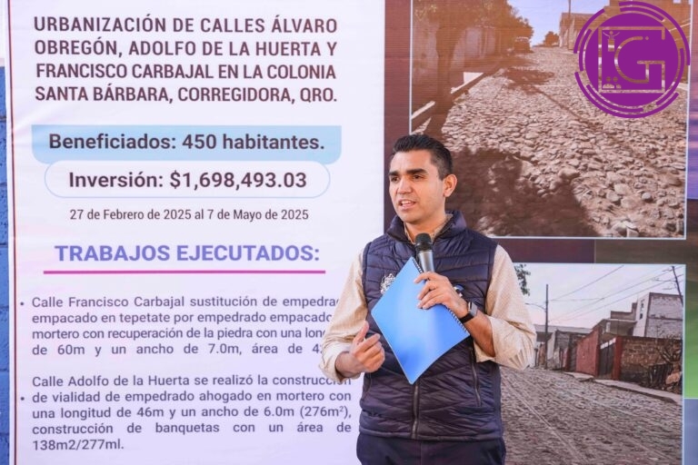 El jefe de Gabinete Municipal de Corregidora, Carlos Contreras, en representación del alcalde Chepe Guerrero, entregó la obra de urbanización de las calles Adolfo de la Huerta, Francisco Carbajal y Adolfo Ruiz Cortines en la colonia Santa Bárbara, la cual beneficia a más de 450 habitantes de la zona gracias a una inversión de 2.3 millones de pesos.