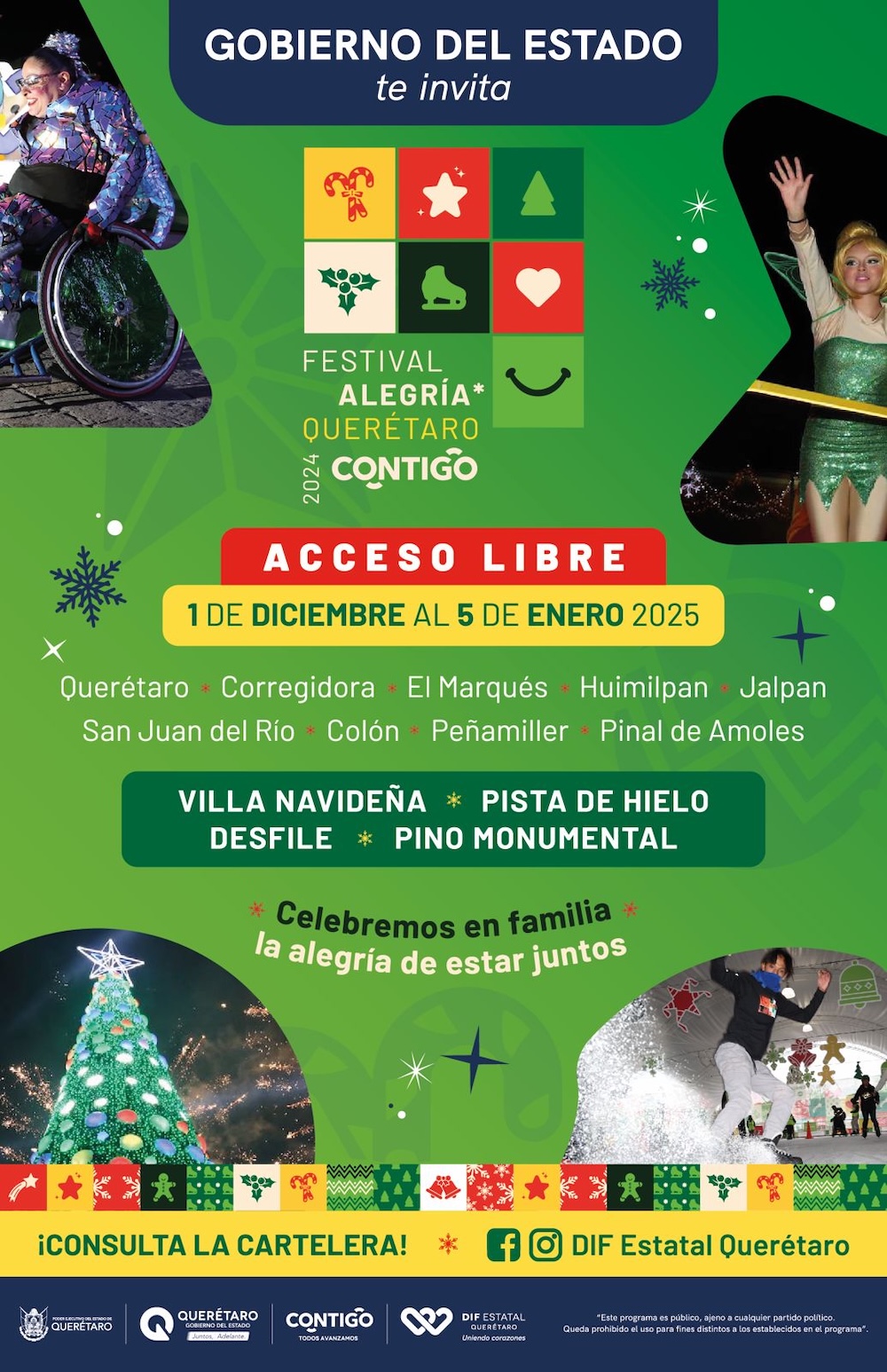 El evento principal será el Mega Desfile Alegría Querétaro Contigo 2024, que se llevará a cabo el próximo 20 de diciembre a partir de las 19:00 horas. Este desfile recorrerá toda la calle Fray Eulalio Hernández Rivera, mejor conocida como avenida Rivera del Río, en El Pueblito, hasta la Plaza Gran Cué, con una impresionante exhibición de 18 carros alegóricos, más de 150 artistas y un espectáculo de pirotecnia que iluminará la ciudad. Se espera la asistencia de más de 8 mil personas para disfrutar de esta muestra de color, música y magia navideña.
