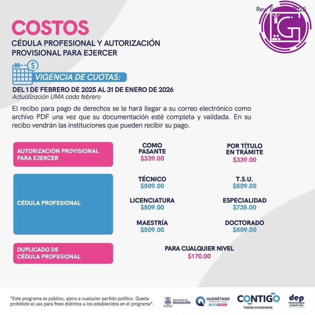 Los costos son: en el caso de la Autorización Provisional para Ejercer la Profesión, ya sea para pasantes o egresados con Título en Trámite, el costo es de 339 pesos; mientras que para Cédula Profesional de nivel Técnico, Técnico Superior Universitario, Licenciatura, Maestría o Doctorado 509 pesos, y para Especialidad 735 pesos. Por otro lado, en caso de requerir un duplicado de Cédula, el costo para cualquier nivel es de 170 pesos.